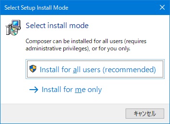 どちらを選択するかは、運用方針によるが、どちらを選んでもcomposerの動作に大きな影響は無いので、デフォルト値(Install for all users(recommended))で良いだろう。