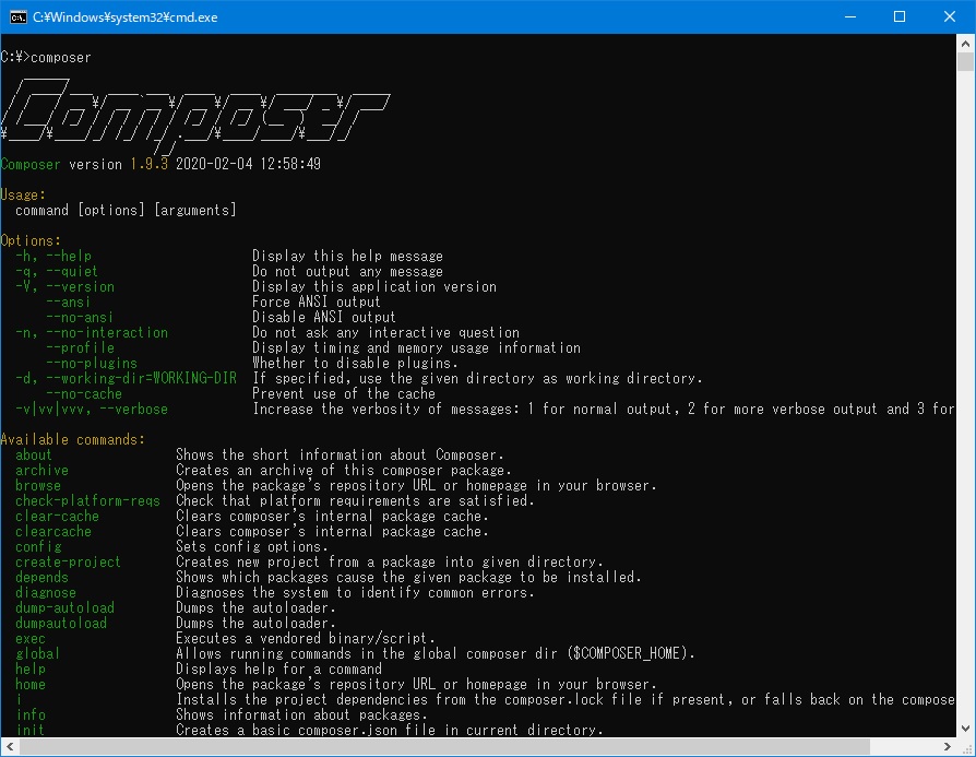 composerのインストールが完了したら、起動確認をする。起動手順は、コマンドプロンプトで「composer」と入力する。上記画面が表示されればcomposerのインストールは完了している。